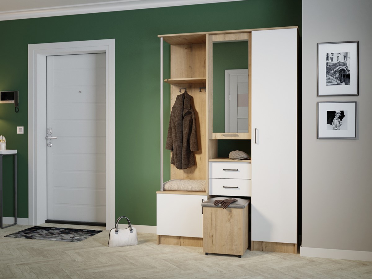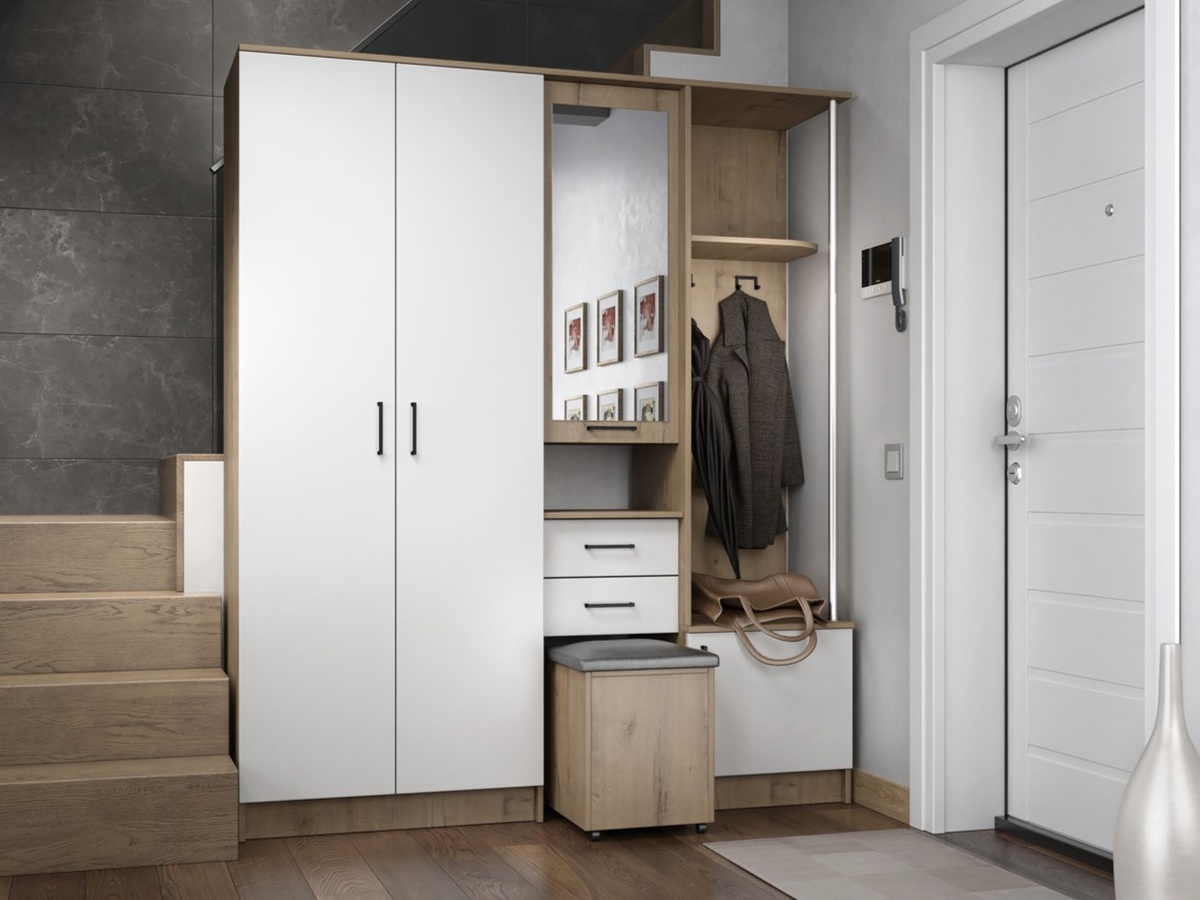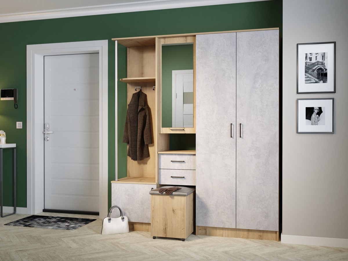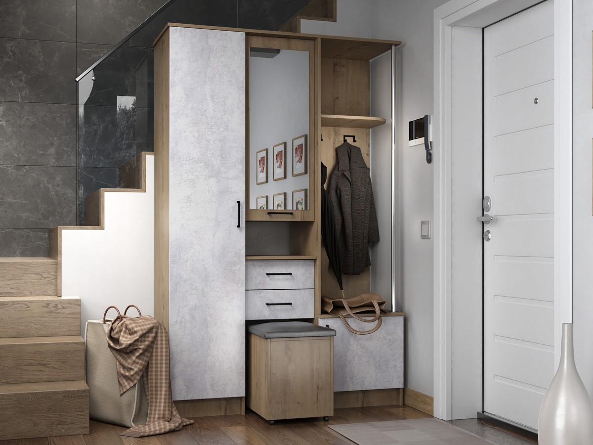 Низкая цена на популярный товар «Прихожая в коридор с зеркалом, шкафом, обувницей, вешалкой, сиденьем, полками, ящиками, тумбой и банкеткой пуфиком DYCA 170 (цемент / бунратти)» на фирменном сайте мебели m-m-mebel.ru